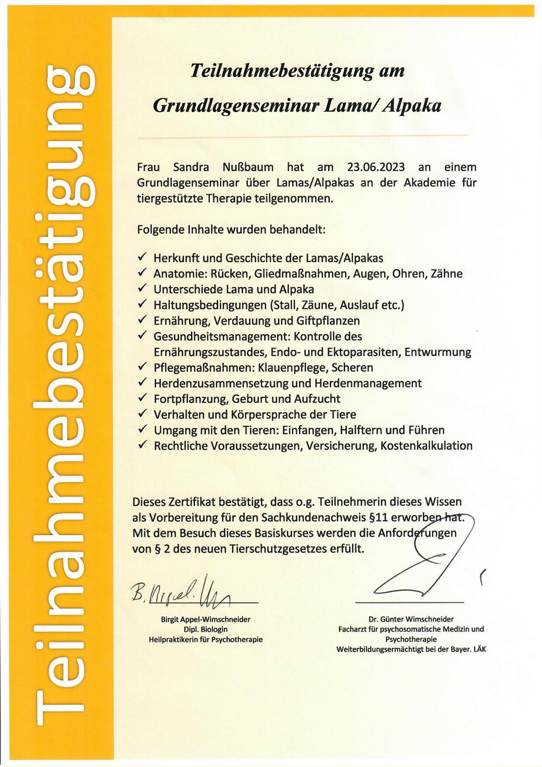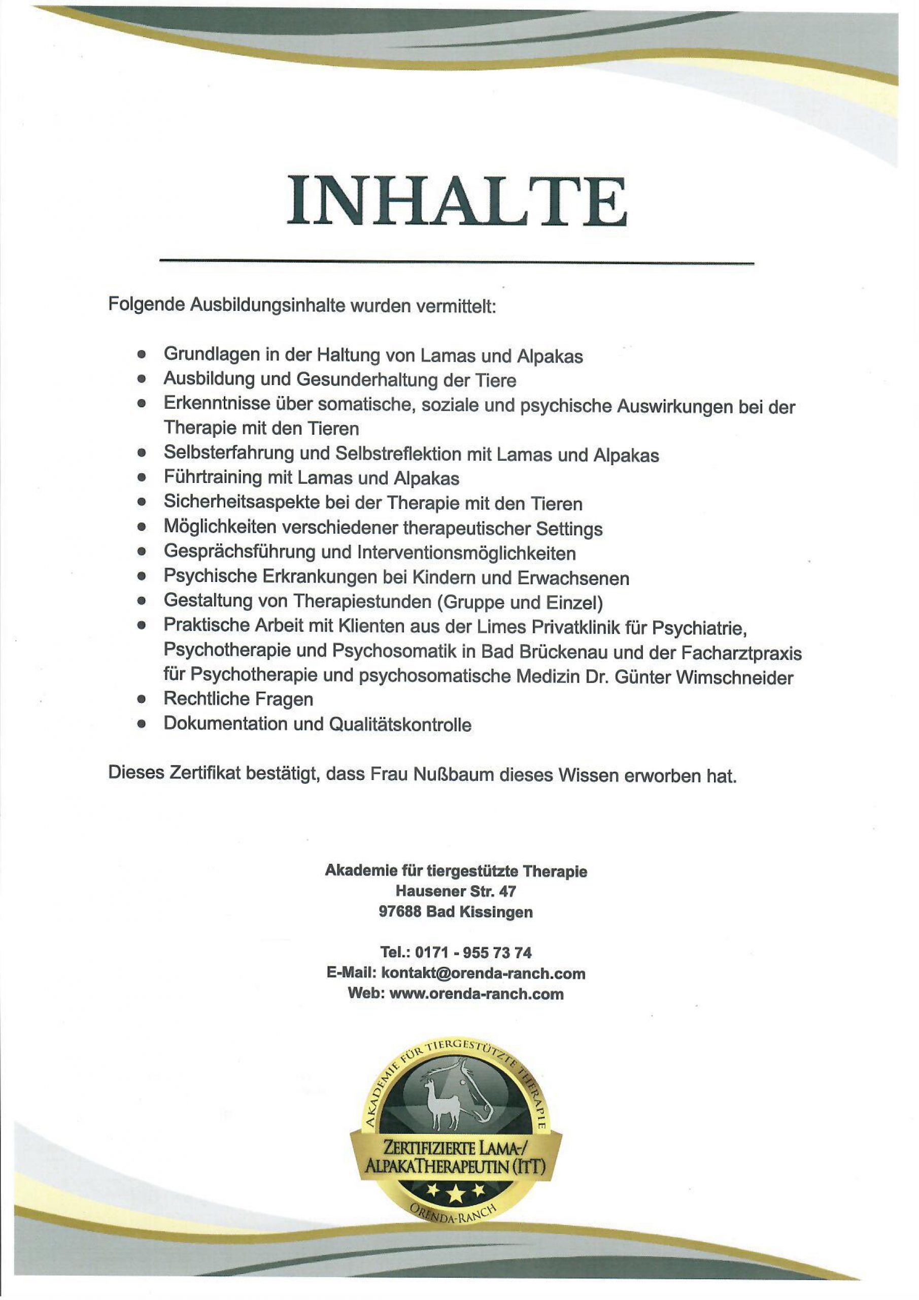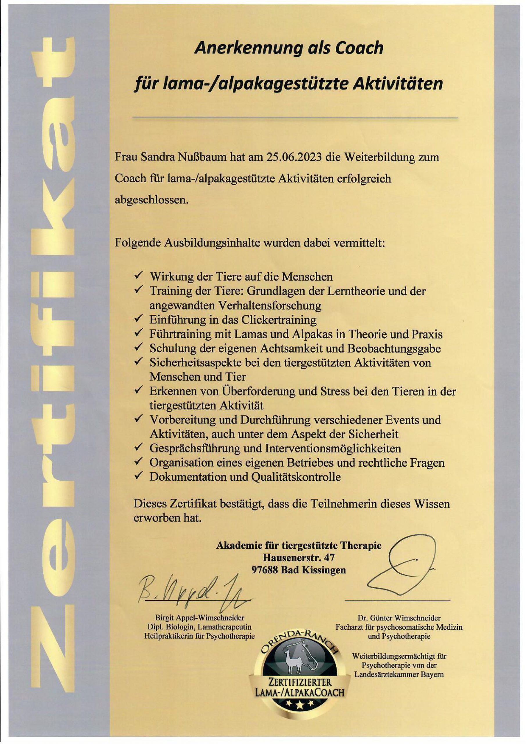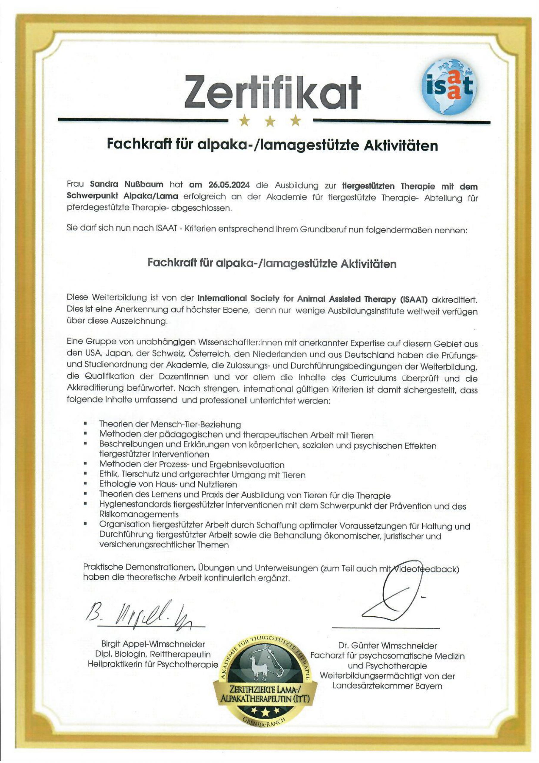 Ich absolvierte die Ausbildung zur Lama- und Alpaka-Therapeutin nach ISAAT („International Society for Animal Assisted Therapy“) und erlangte 2024 das entsprechende Zertifikat.